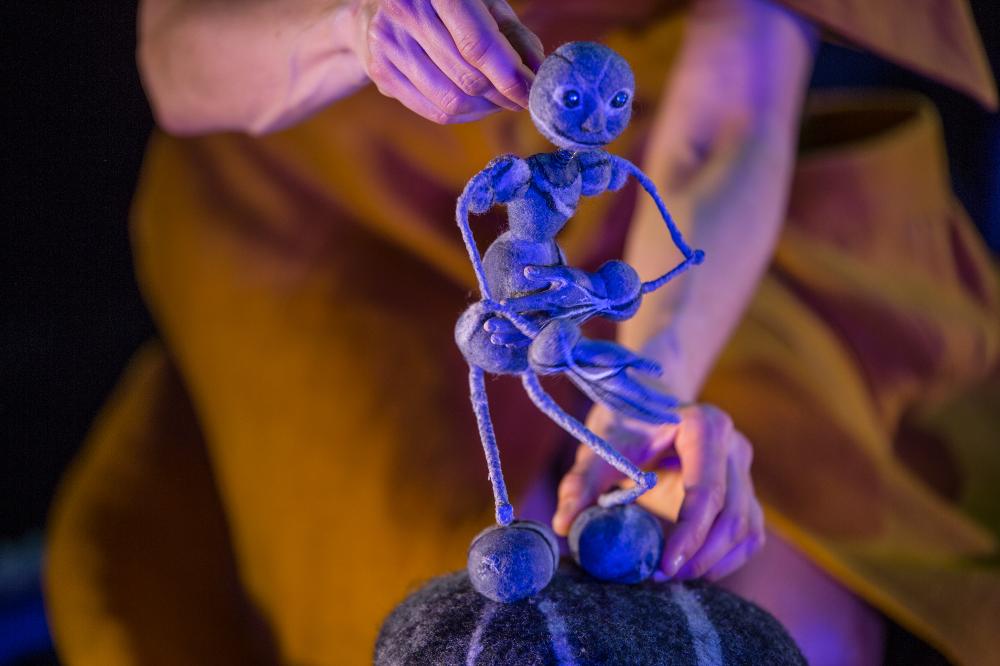 La Mer/Mère se dévoile doucement. Sur la plage, entre les galets, une petite marionnette minérale
